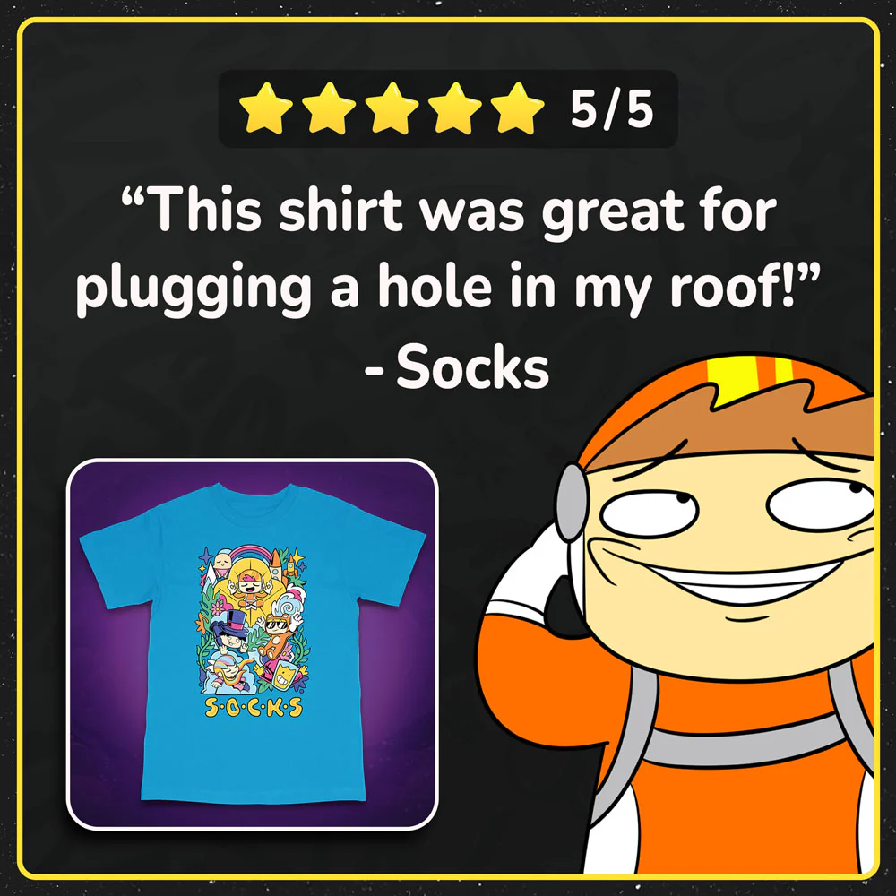 Ever wonder where the Socks Crew will go when they die? Of course not, you're probably a normal person. To answer the question, they go to Socks Heaven! The Socks Heaven Shirt is soft as a cloud and vibrant as a blue sky. As a bonus, this shirt doubles as a portal! Stare at it long enough and you'll be transported to the whimsical heavenly dimension where really anything is possible. Pro tip: stay away from the giant yellow flower.